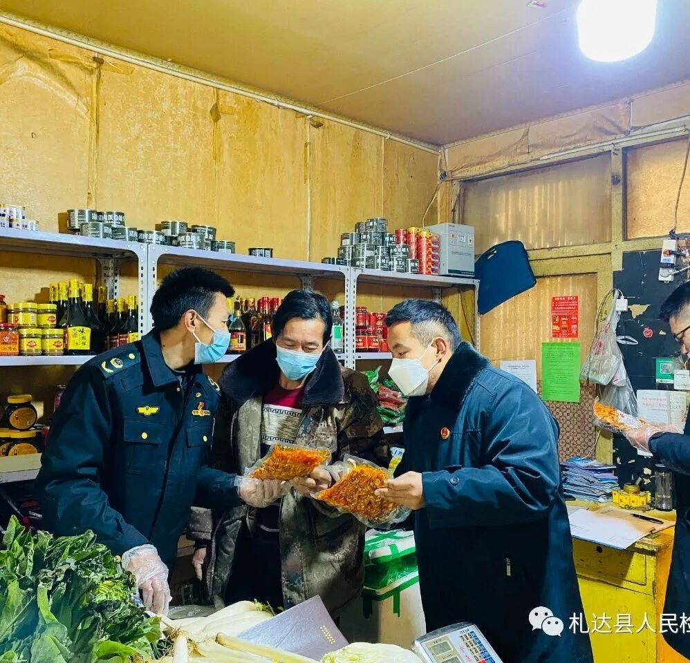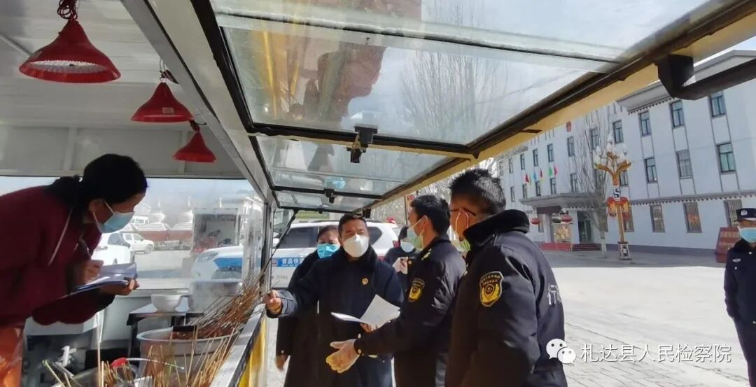 为充分发挥检察公益诉讼职能,进一步强化法律监督力度,全力保障人民群众“舌尖上的安全”,1月18日,札达县人民检察院联合县市场监督管理局、县卫健委、县农业农村局、县公安局等单位在全县范围内开展节前食品药品安全大排查。 检查组先后深入县农贸市场、各大超市、大小餐馆,针对节前蔬菜水果、大米面食、冷链食品、卫生环境等检查重点,紧紧围绕证件是否齐全、食品是否过期、是否明码标价、肉质是否检疫、环境是否整洁、健康证是否及时更新等方面进行全面细致监督检查。同时,要求食品生产经营者、餐饮服务业工作人员要进一步加强食品生产、加工、销售各个环节的资质办理、环境卫生、防疫检疫等方面的严格把关、自查整改力度,切实担负起食品安全第一责任人责任。 此次联合大检查共监督检查食品经营单位20家,我院全程监督行政执法机关查扣大米面粉、泡菜腊肉等过期食品12种,价值1802元,同时,对5家食品经营店健康证过期和更换不及时问题现场监督县卫健委督促相关当事人限期整改。